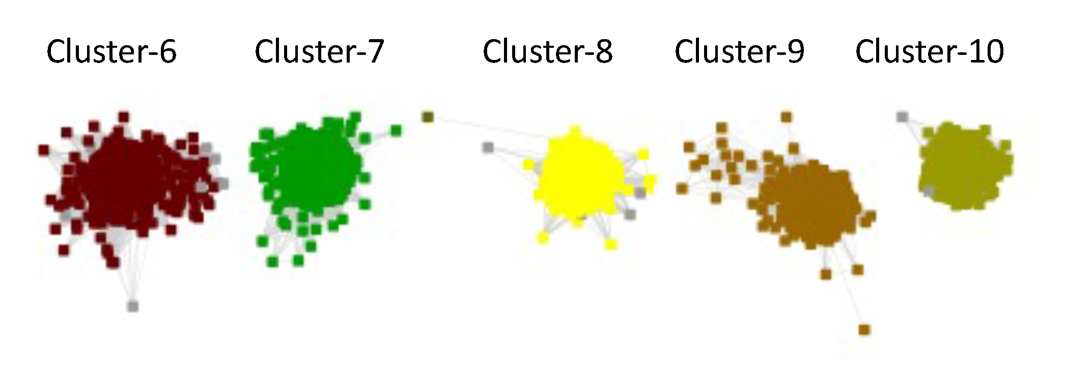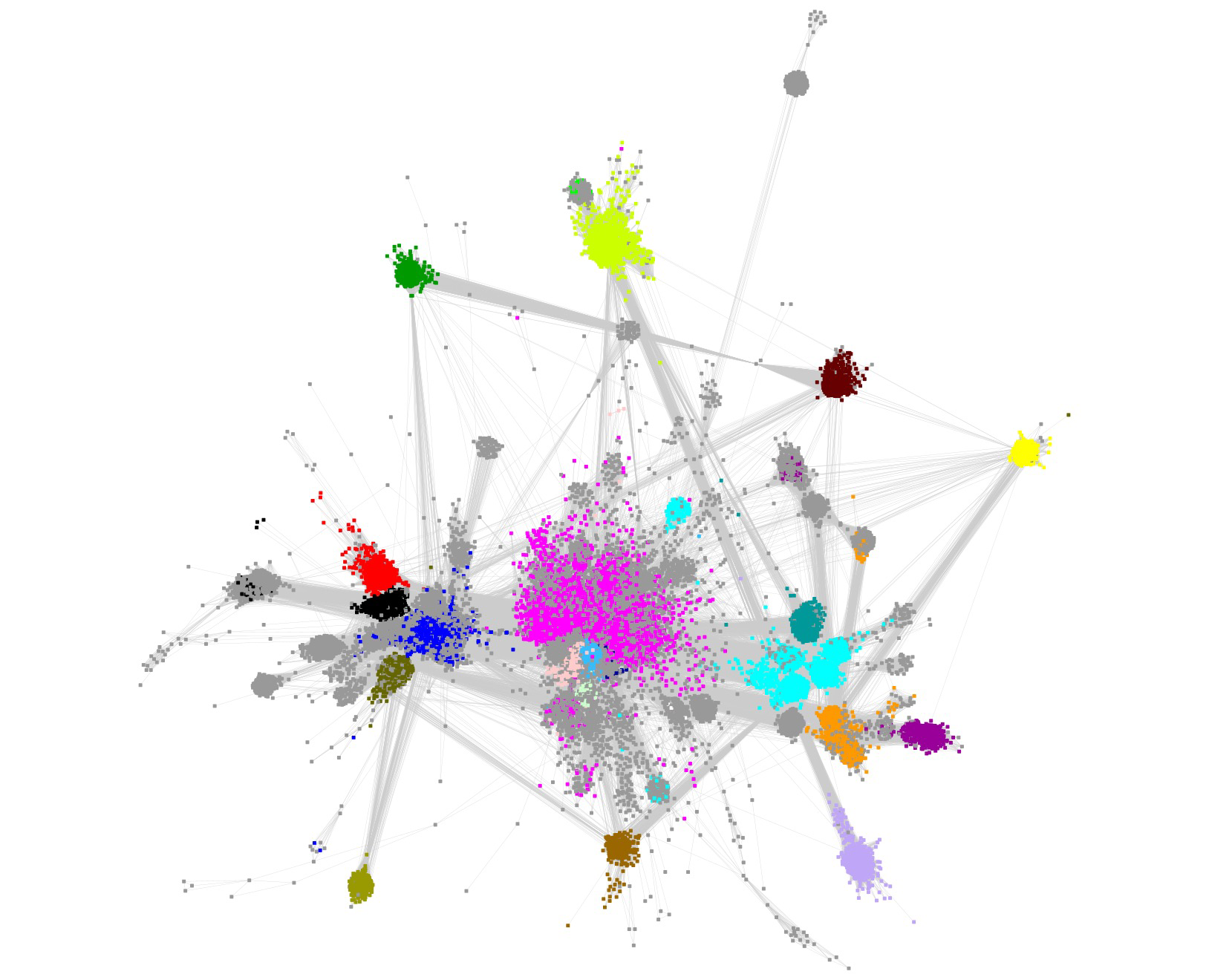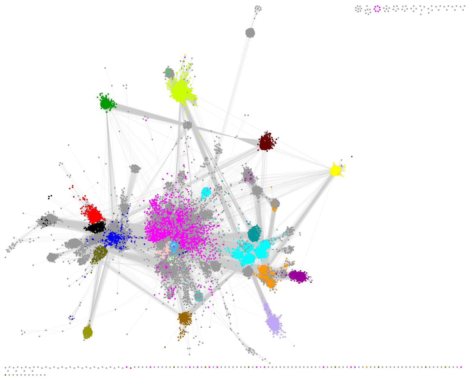 The nodes were segregated into six subgroups by selecting the colors associated with the major nodes in the segregated AS27 SSN and moving them to allow deletion of the connecting edges; the nodes with other colors were merged with the "closest" major subgroup.