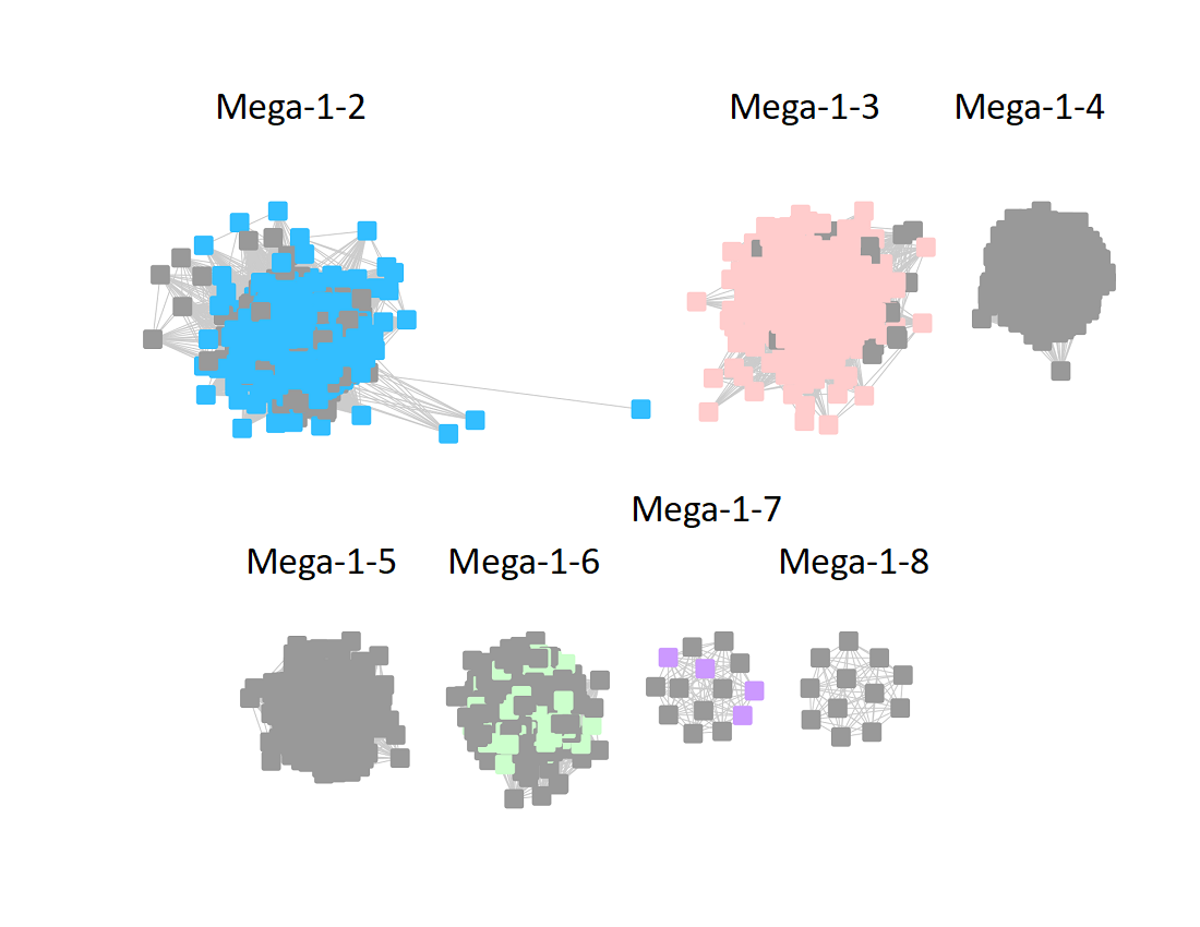 The UniRef50 SSN for Megacluster-1-2 through Megacluster-1-8 is displayed below. The clusters are numbered in order of decreasing number of UniRef50 nodes.