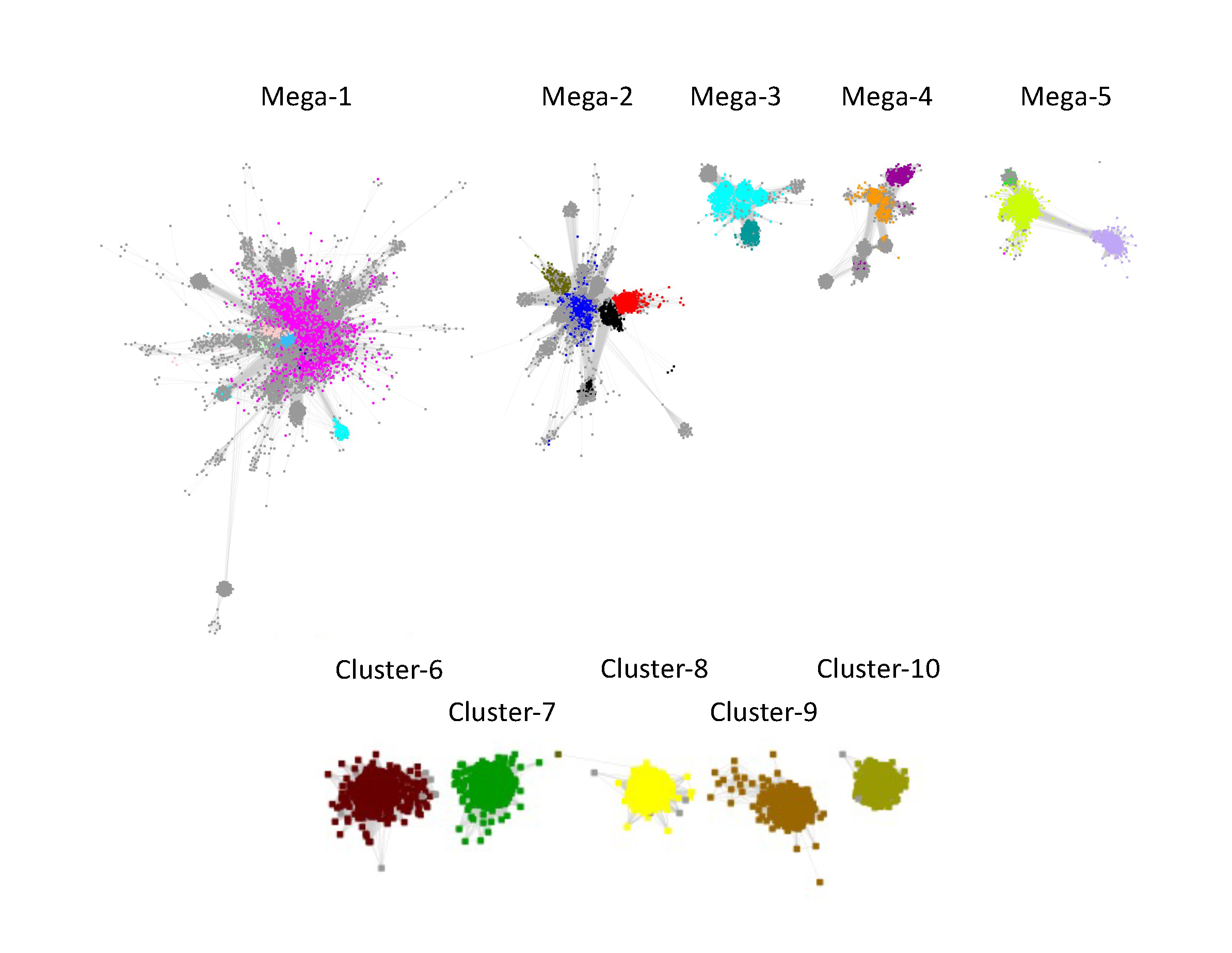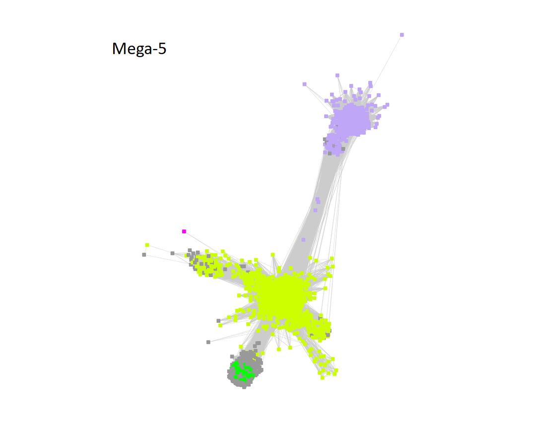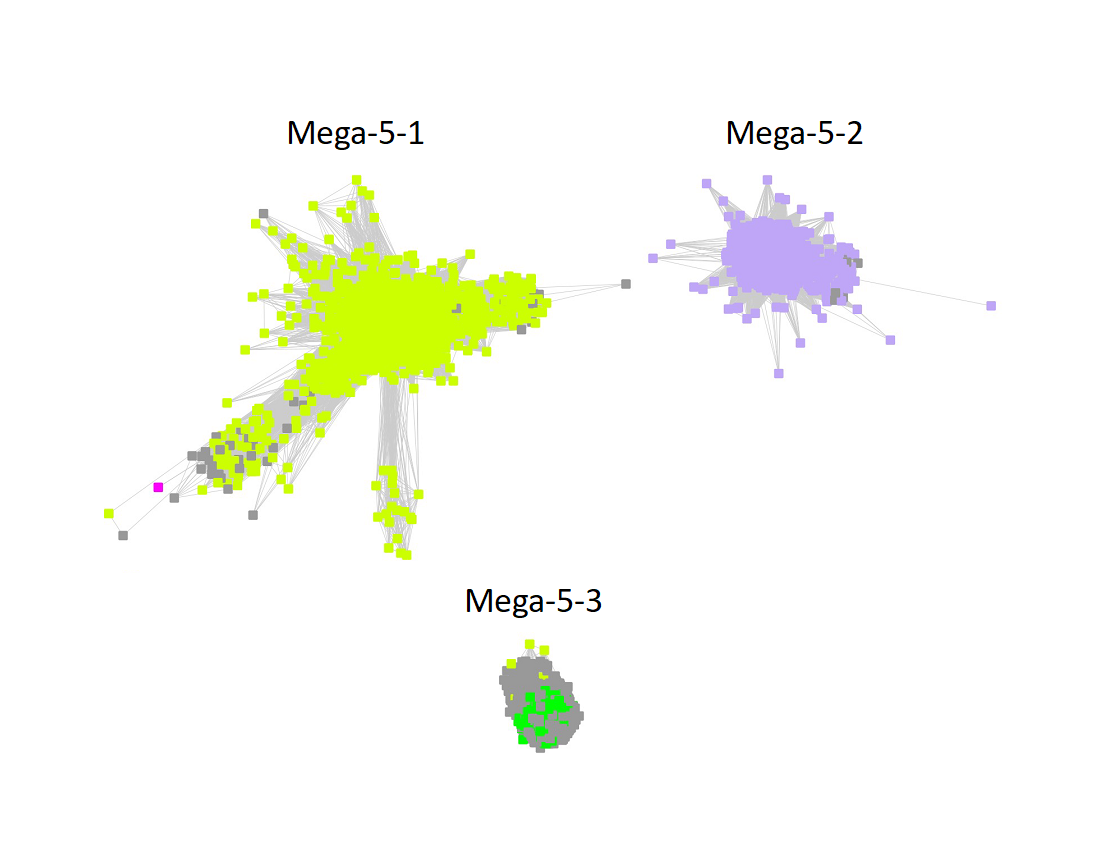 As described in the tabs, Megaclusters-1, -2, -3, -4, and -5 were segregated into component subgroups.